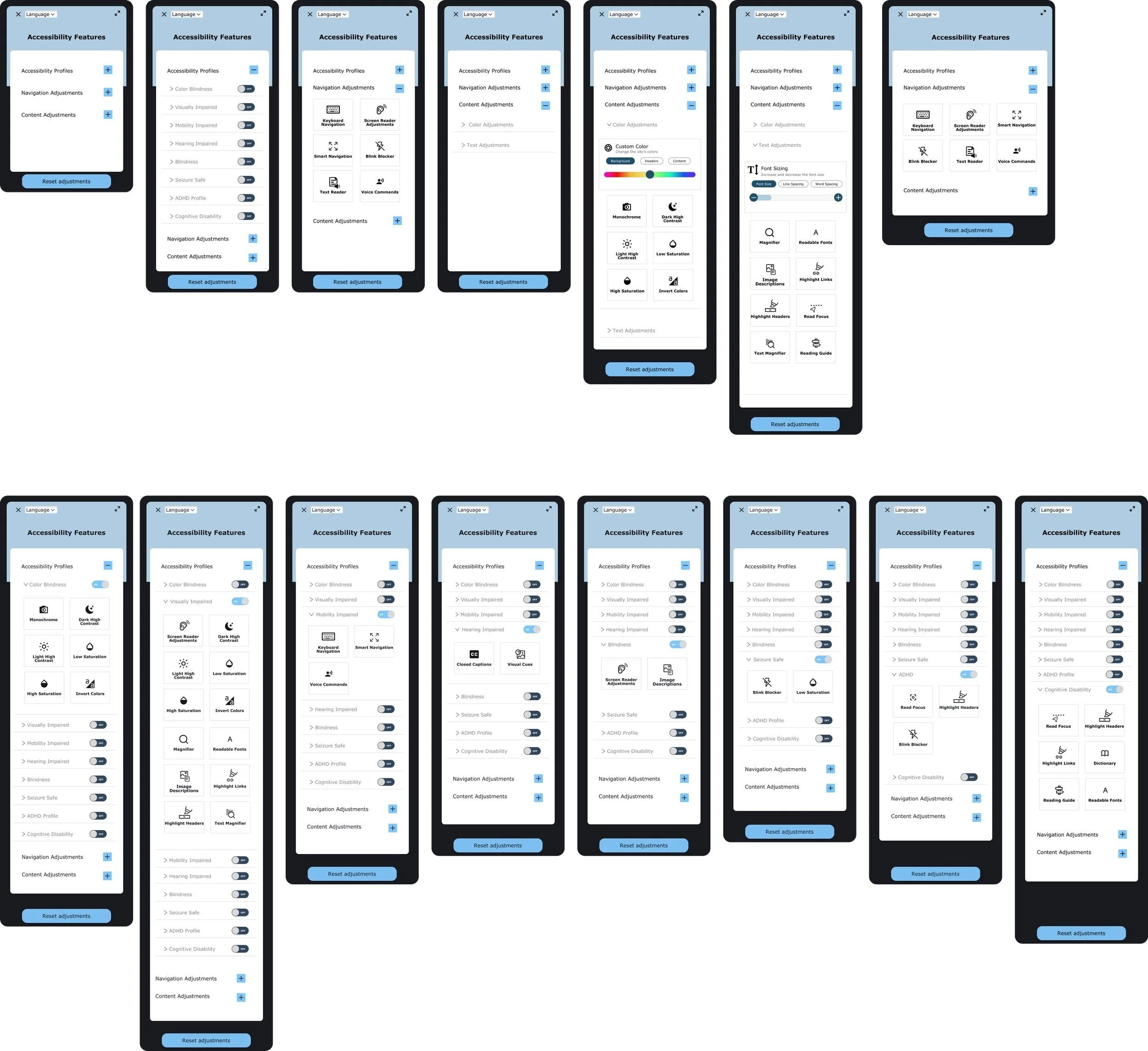 I used an accordion component to make the plugin as unobtrusive as possible so as not to overwhelm the user with all of the different options. I created profiles for the most common types of disabilities using the WCAG as my guide and used toggle switches and checkboxes for complete customization of the features.